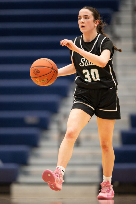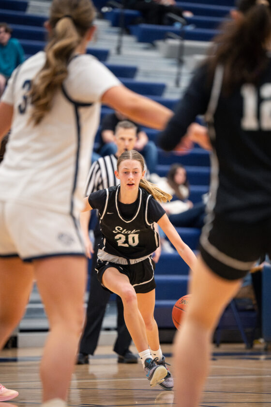 Free State freshman Morgan McClorey dribbles the ball down the court at Mill Valley on Friday, Feb. 27, 2026 in Shawnee.