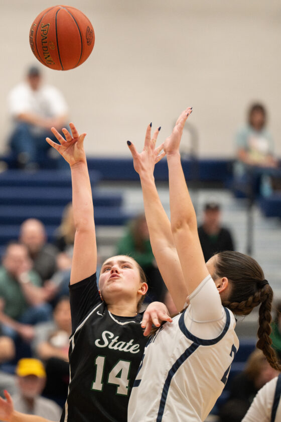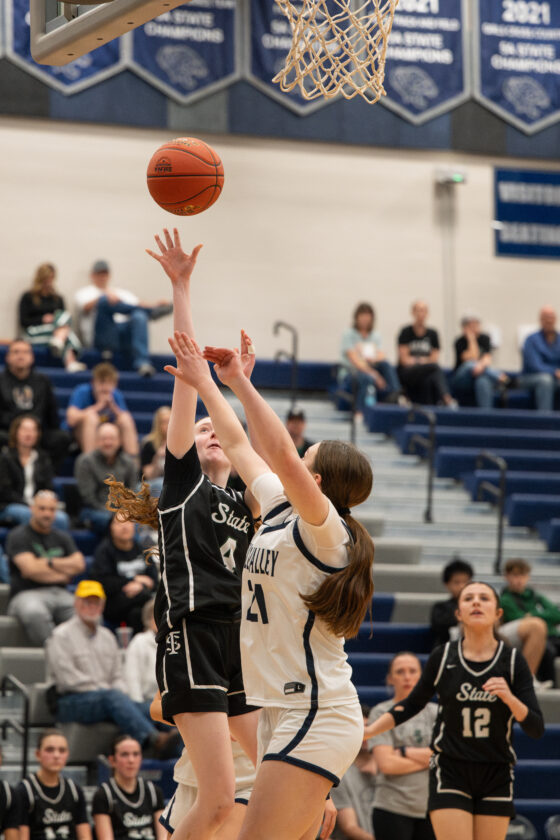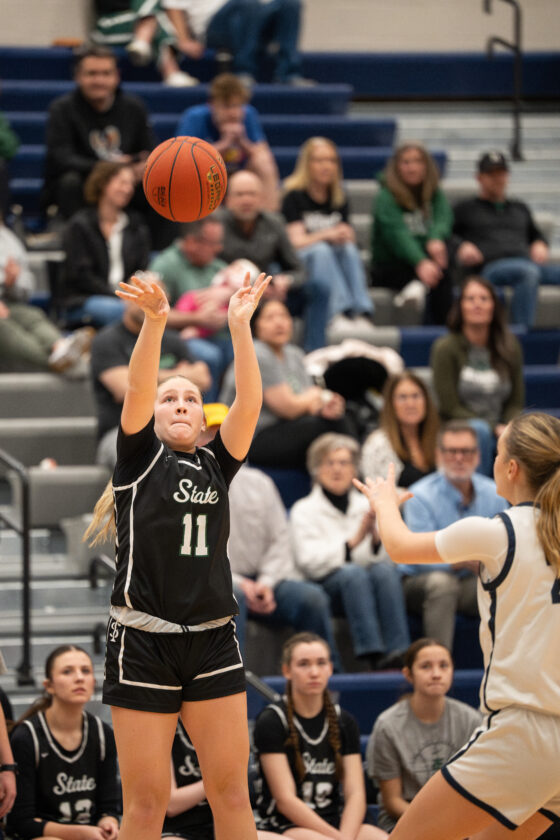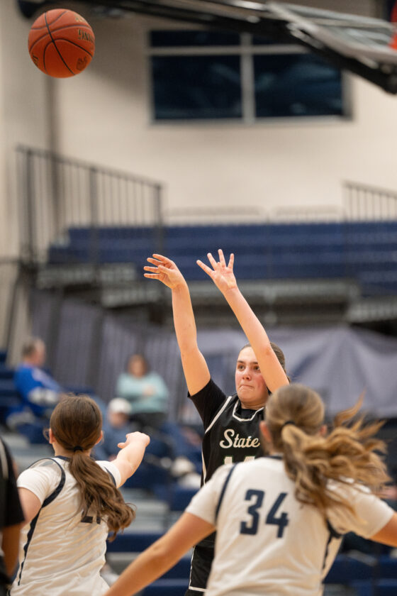 Free State freshman Quinnlynn Vail hits a 3-pointer at Mill Valley on Friday, Feb. 27, 2026 in Shawnee.