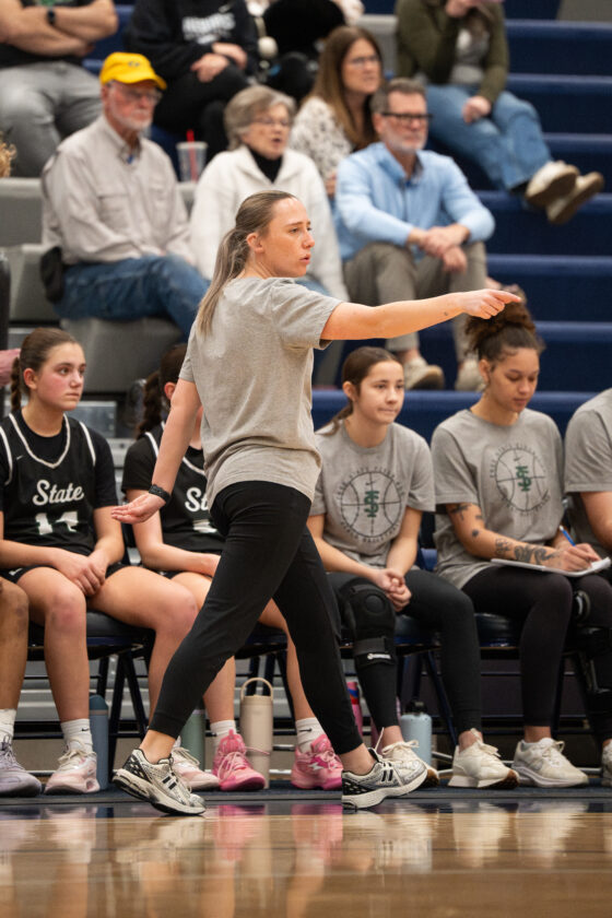 Free State head coach Summer Frantz calls out instructions to her team at Mill Valley on Friday, Feb. 27, 2026 in Shawnee.