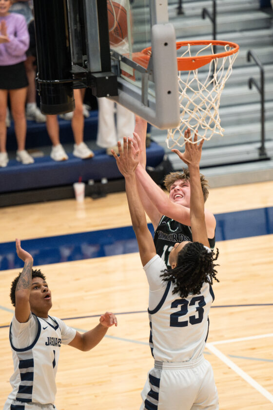 Free State sophomore Jadon Clock makes a heavily defended layup at Mill Valley on Friday, Feb. 27, 2026 in Shawnee.