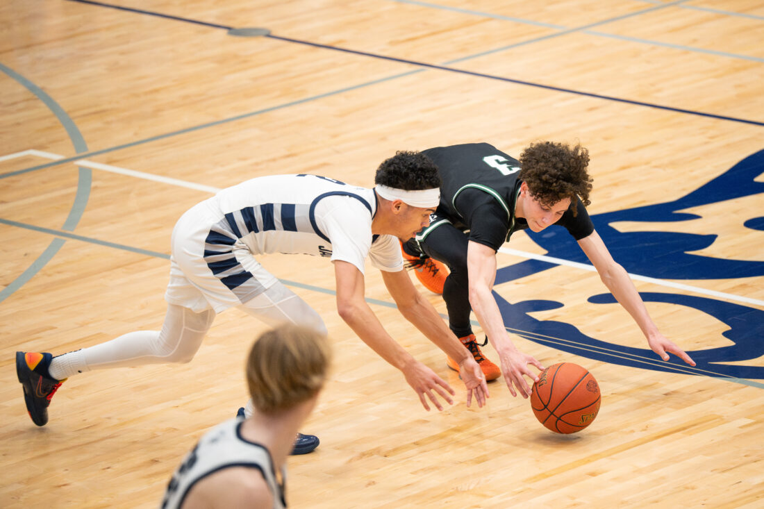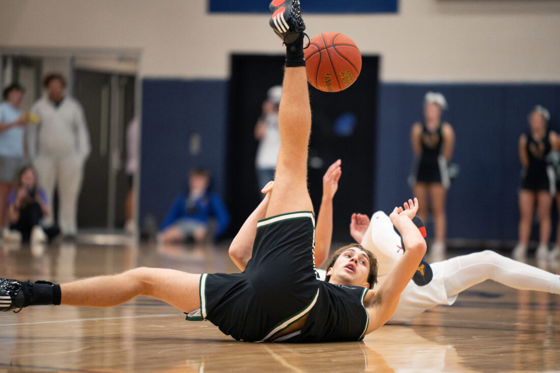 Free State sophomore Brendan Barrett dives for a loose ball at Mill Valley on Friday, Feb. 27, 2026 in Shawnee.