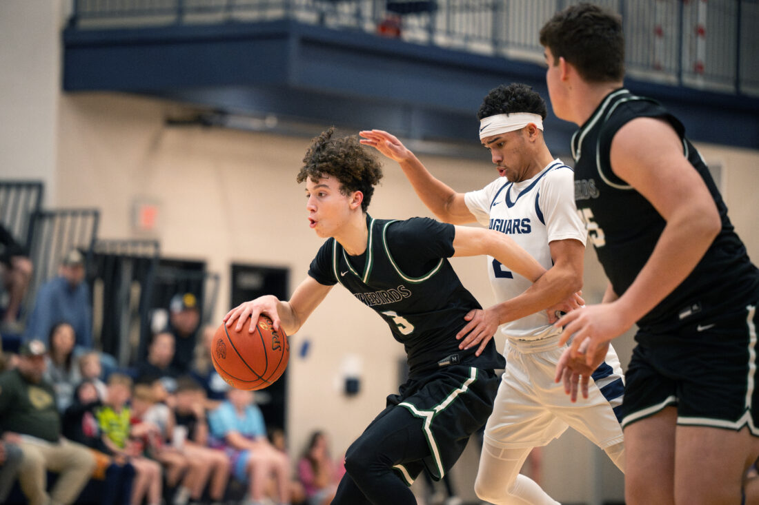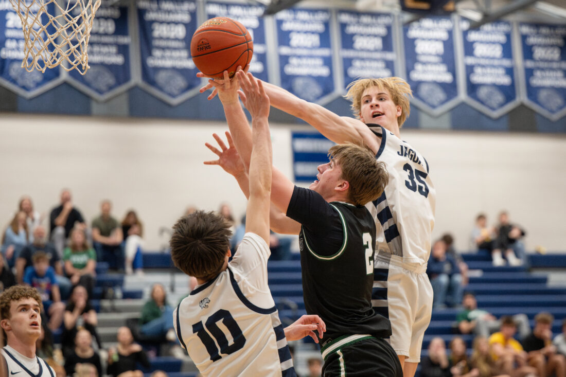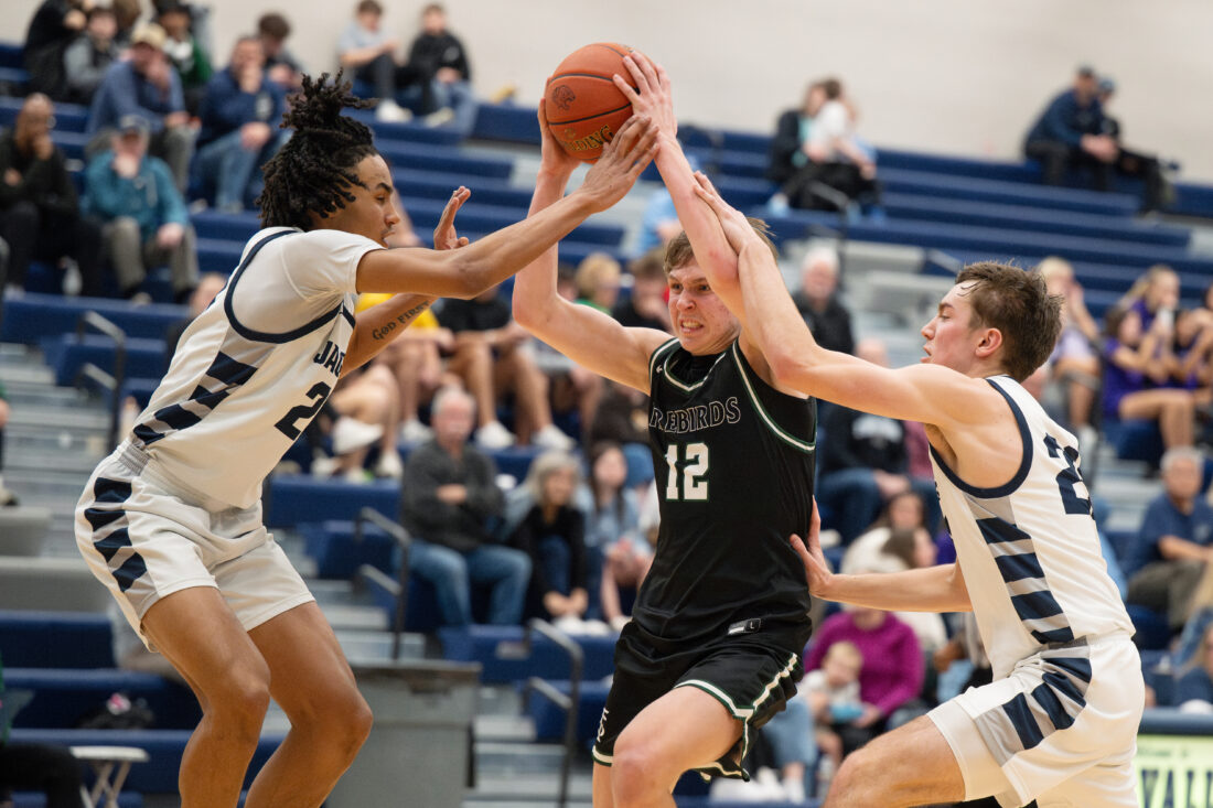 Lawrence Free State senior Bennett Nagel passes the ball to a teammate after gaining control of a loose ball at Mill Valley on Friday, Feb. 27, 2026 in Shawnee.