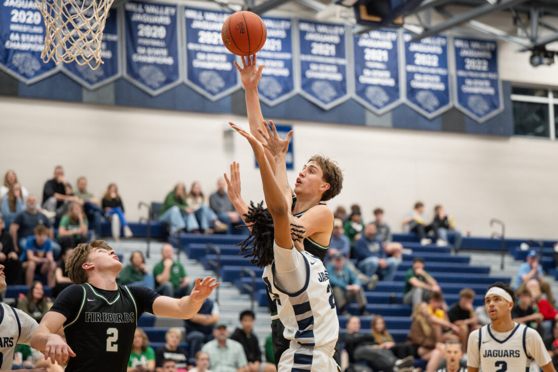 Free State senior Bennett Nagel puts up a one-handed shot at Mill Valley on Friday, Feb. 27, 2026 in Shawnee.