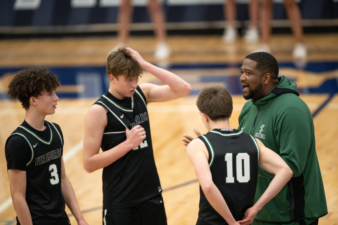 Free State head coach Dwayne Paul talks with his team during a break in play at Mill Valley on Friday, Feb. 27, 2026 in Shawnee.