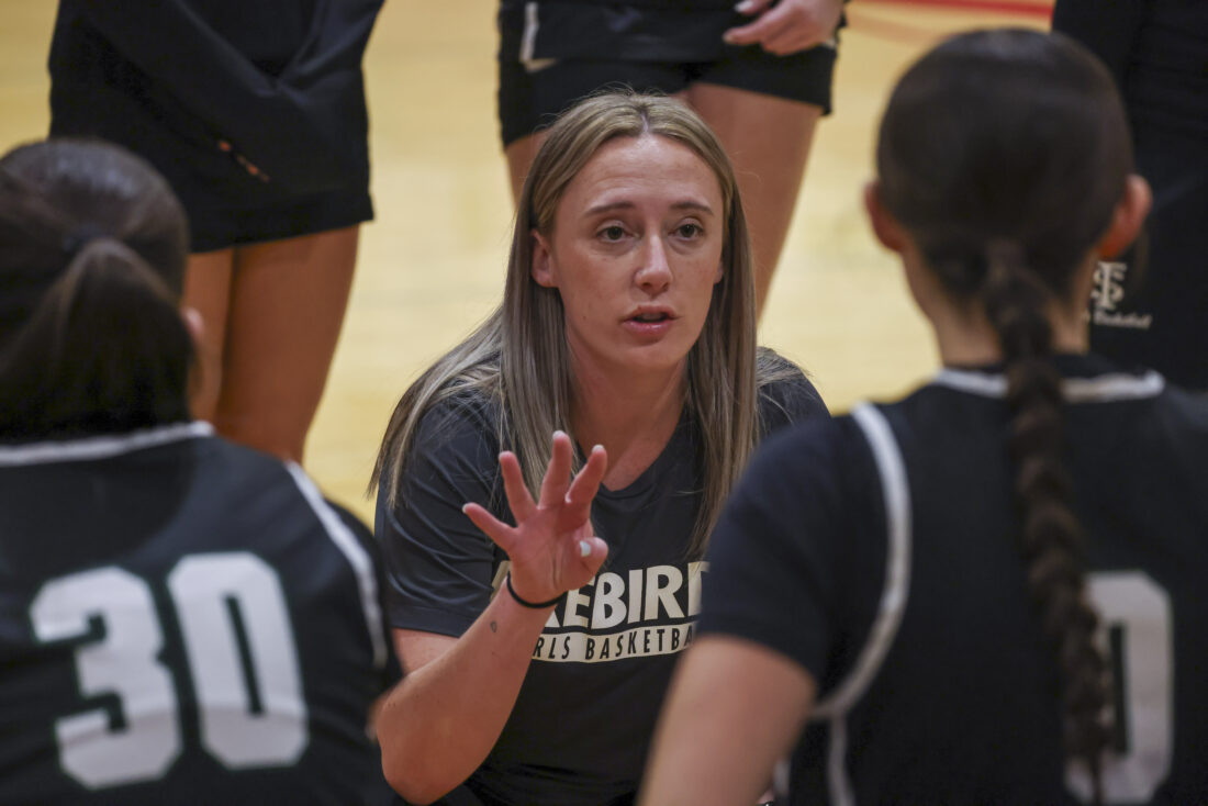 Free State head coach Summer Frantz speaks with her team prior to the Firebirds’ game against Atchison on Friday, Jan. 2, 2026, at Atchison High School in Atchison.