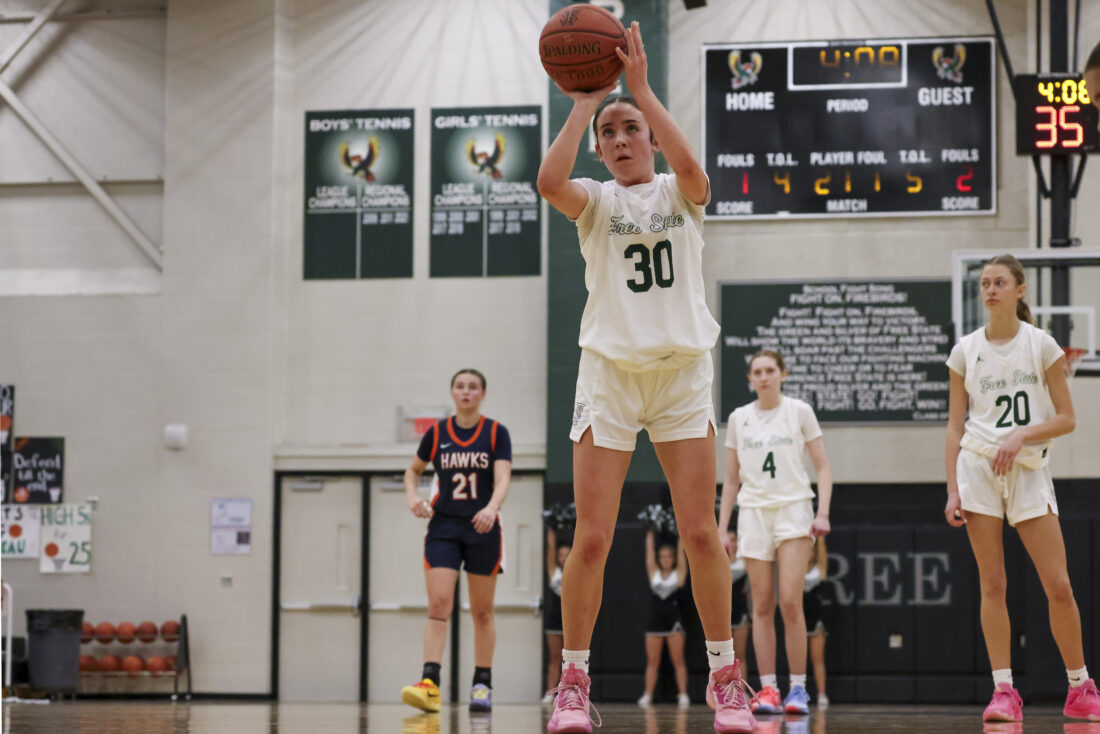 Following another bucket by McClorey, a 3-pointer by Olathe East made it a 10-point game before senior Addie Fulscher scored her first four points of the game in a row to cut the deficit back to six. Both teams scored one last field goal, including a McClorey layup with 24 seconds left to make the halftime total 23-17 in favor of the Hawks.