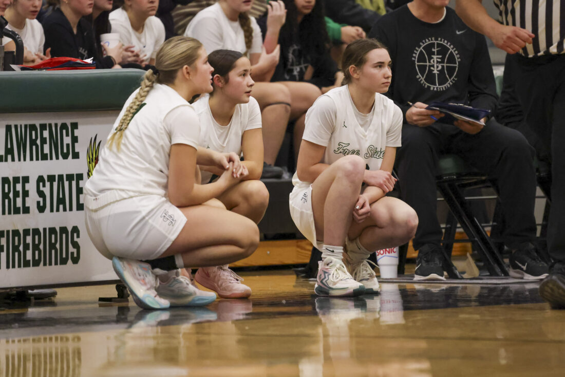 Free State’s Libby Easter, Addie Fulscher, and Mallary Hice (left to right) wait to check in during the Firebirds’ game against Olathe East on Friday, Jan. 16, 2026, at Free State High School in Lawrence.