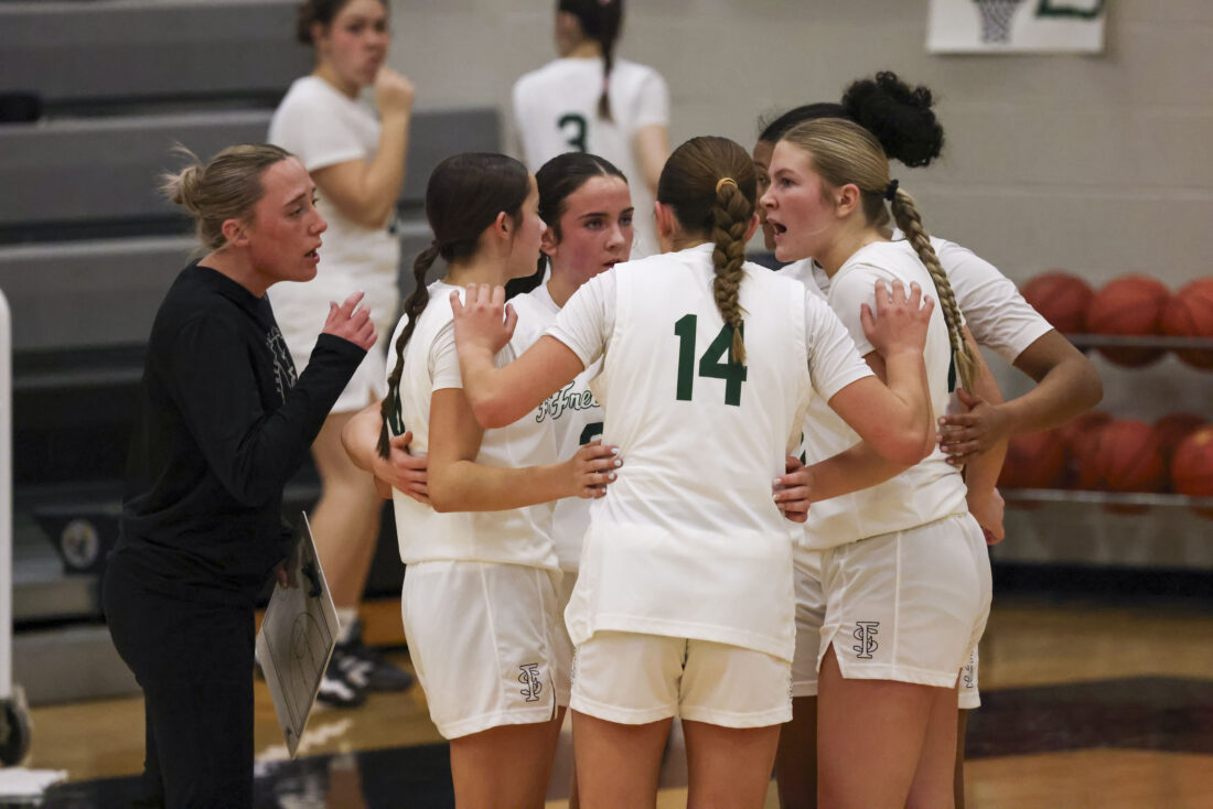 The Free State girls basketball team huddles on the court during the Firebirds’ game against Olathe East on Friday, Jan. 16, 2026, at Free State High School in Lawrence.