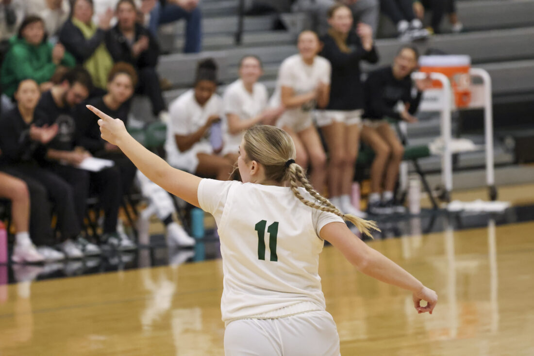 Free State senior Libby Easter points to a teammate after recording an assist during the Firebirds’ game against Olathe East on Friday, Jan. 16, 2026, at Free State High School in Lawrence.