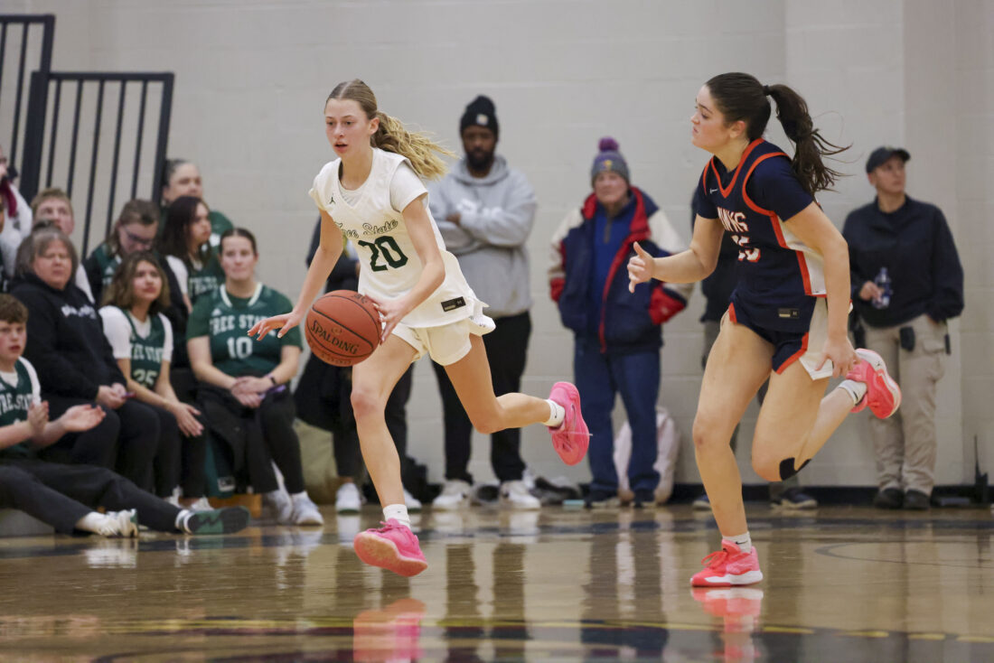 Free State freshman Taylor Hulcher brings the ball up during the Firebirds’ game against Olathe East on Friday, Jan. 16, 2026, at Free State High School in Lawrence.
