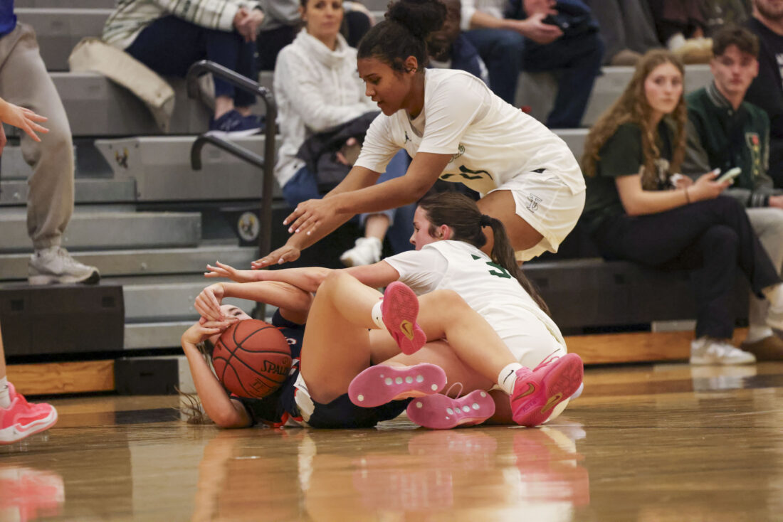 Free State players battle for a loose ball during the Firebirds’ game against Olathe East on Friday, Jan. 16, 2026, at Free State High School in Lawrence.