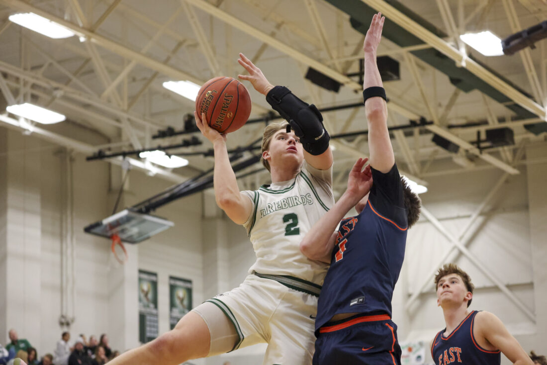 Free State senior Bennett Nagel goes up for a basket during the Firebirds’ game against Olathe East on Friday, Jan. 16, 2026, at Free State High School in Lawrence.