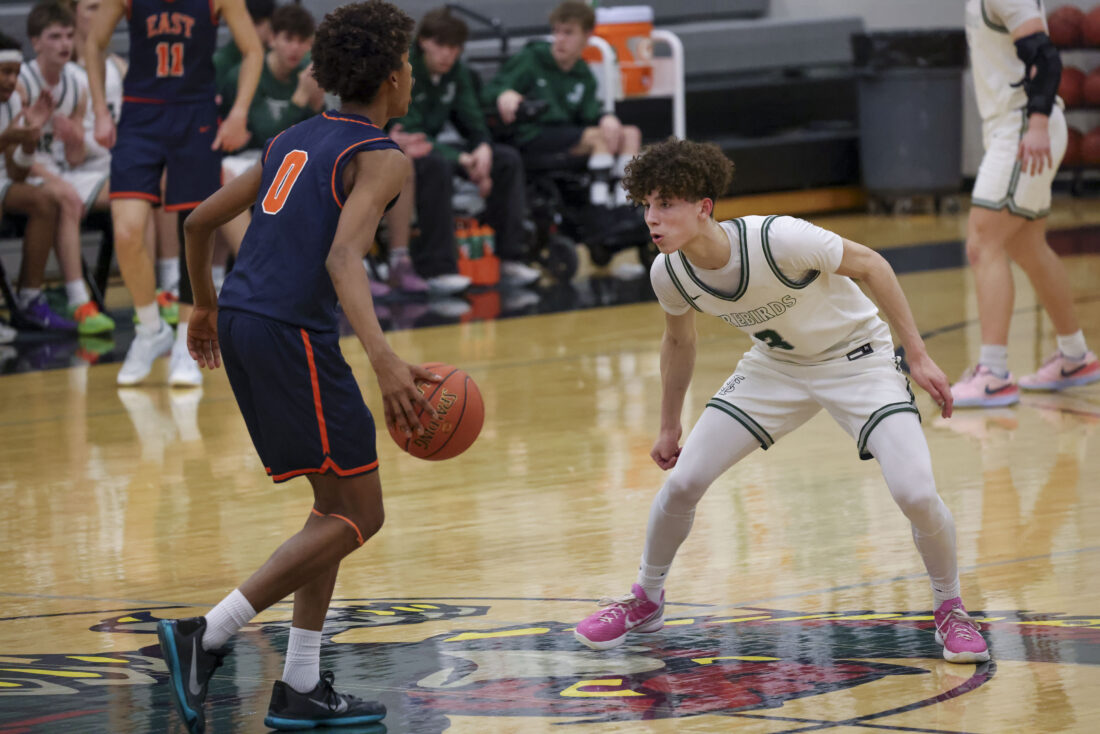 Free State senior Bennett Nagel (11) and sophomore Jayden Williams keep their hands up during the Firebirds’ game against Olathe East on Friday, Jan. 16, 2026, at Free State High School in Lawrence.