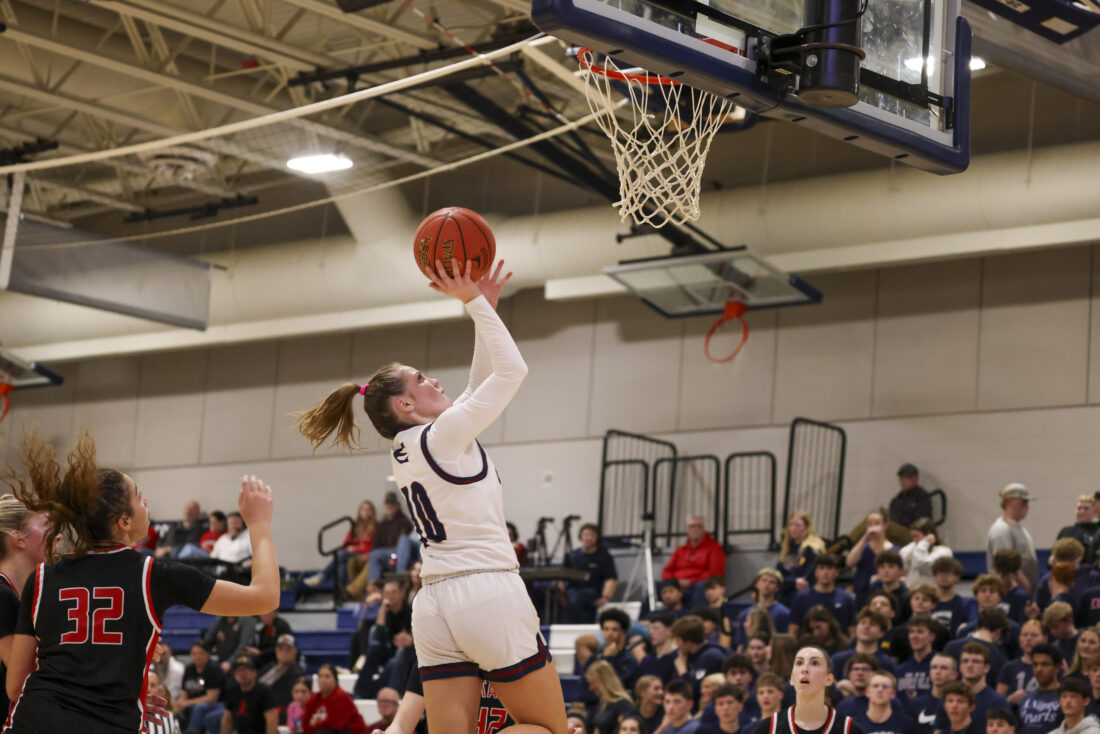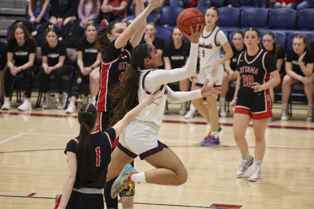 Eudora sophomore Avah Dye goes up strong to the basket during the Cardinals’ game against Ottawa on Friday, March 6, 2026, at Eudora High School in Eudora.