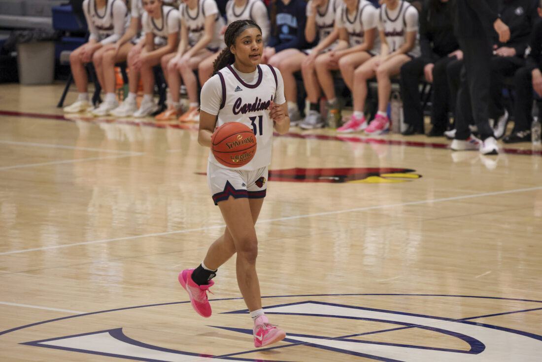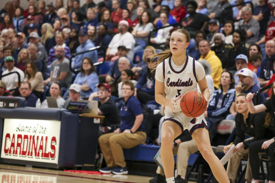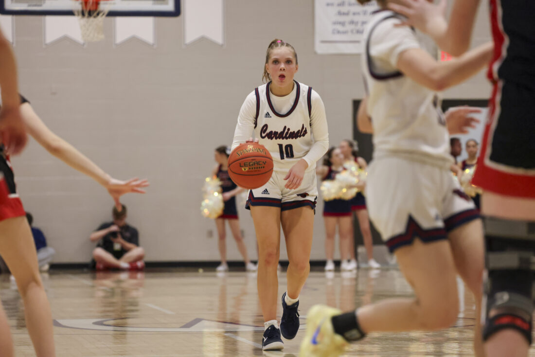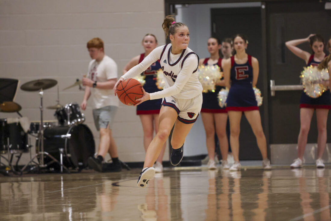 Eudora junior Brynn Deterding brings the ball down the court during the Cardinals’ game against Ottawa on Friday, March 6, 2026, at Eudora High School in Eudora.