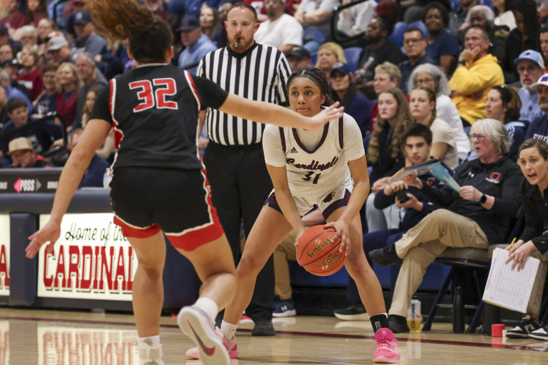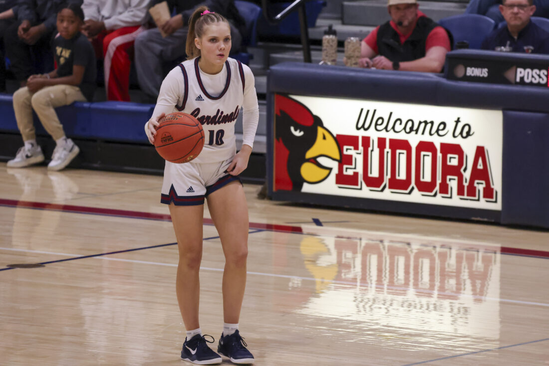 Eudora freshman Payton Lewis collects her dribble during the Cardinals’ game against Ottawa on Friday, March 6, 2026, at Eudora High School in Eudora.