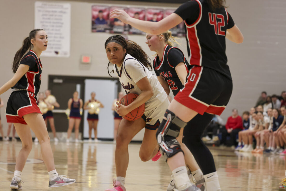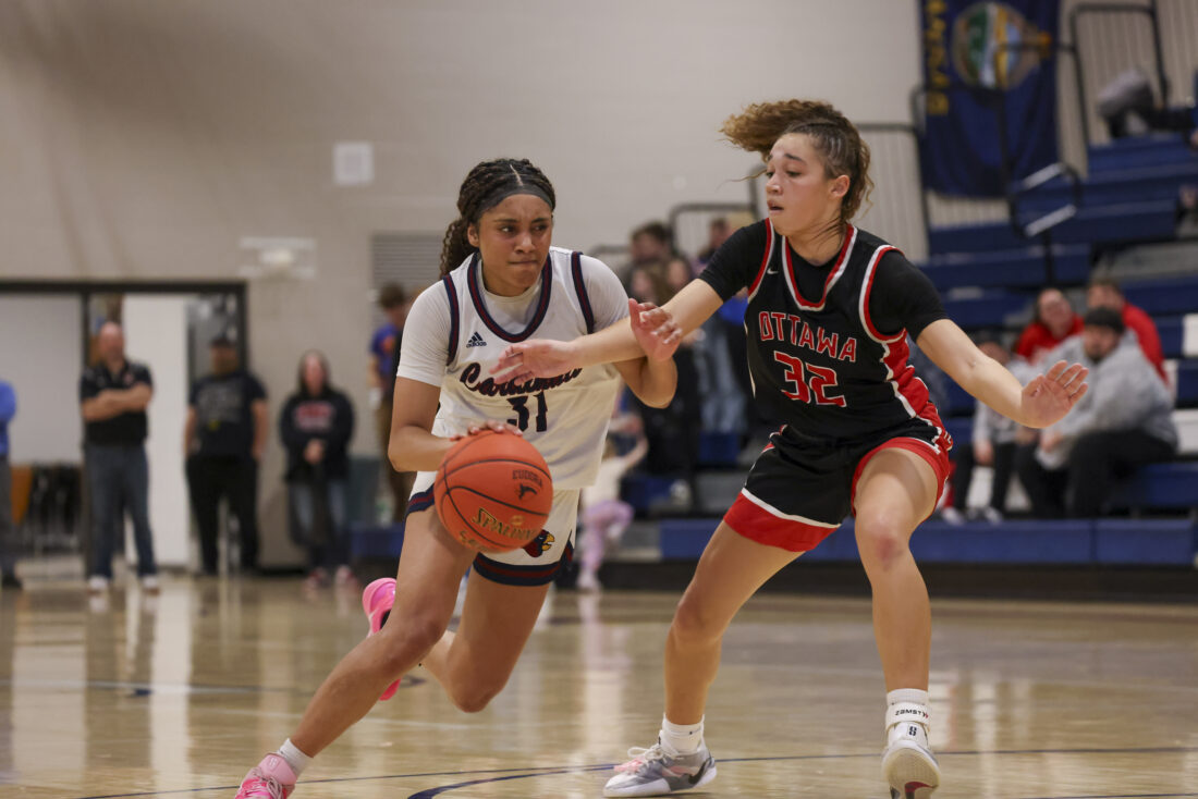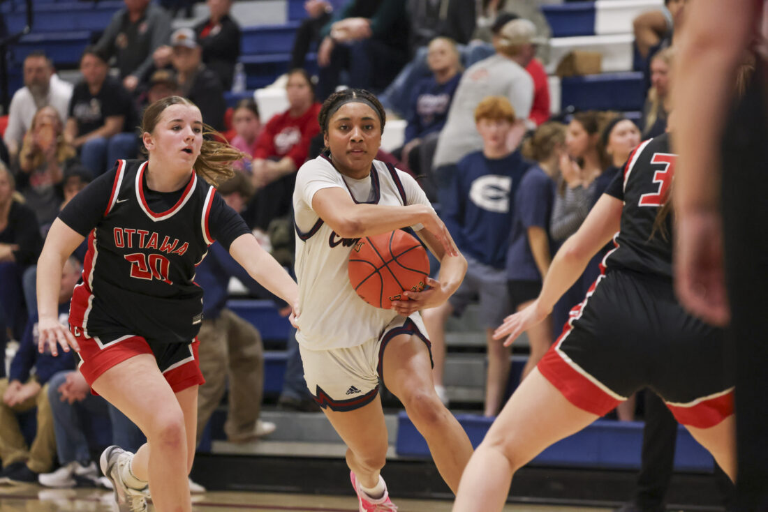 Eudora sophomore Jayla Colter looks to get past her defender during the Cardinals’ game against Ottawa on Friday, March 6, 2026, at Eudora High School in Eudora.