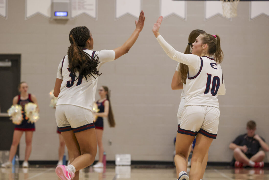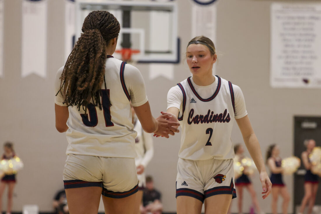 Eudora sophomore Jayla Colter (left) and junior Brynn Deterding high five during the Cardinals’ game against Ottawa on Friday, March 6, 2026, at Eudora High School in Eudora.