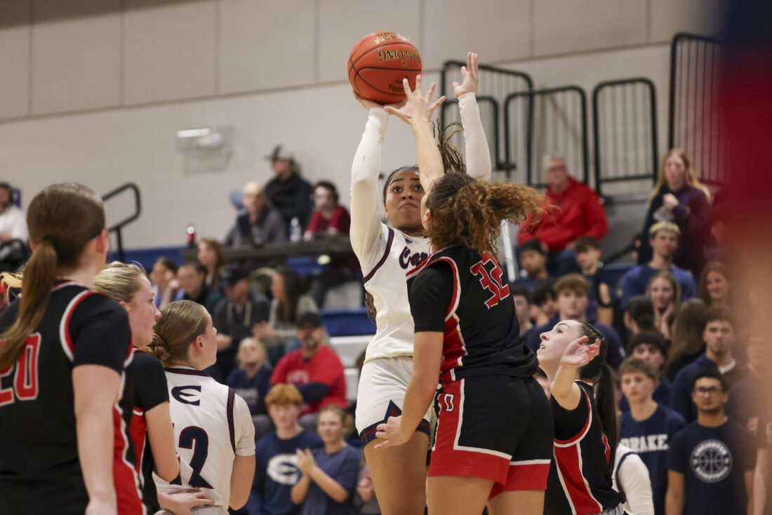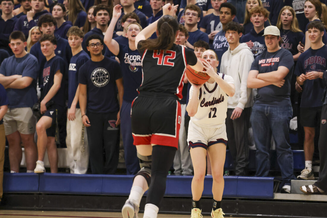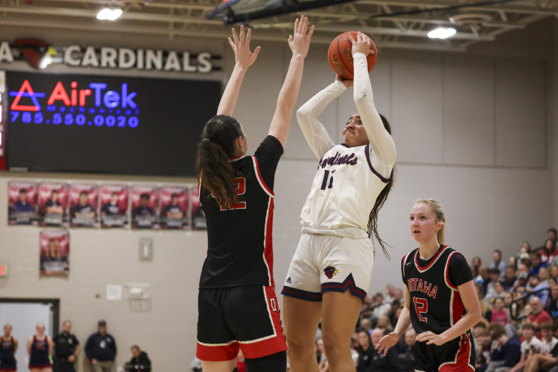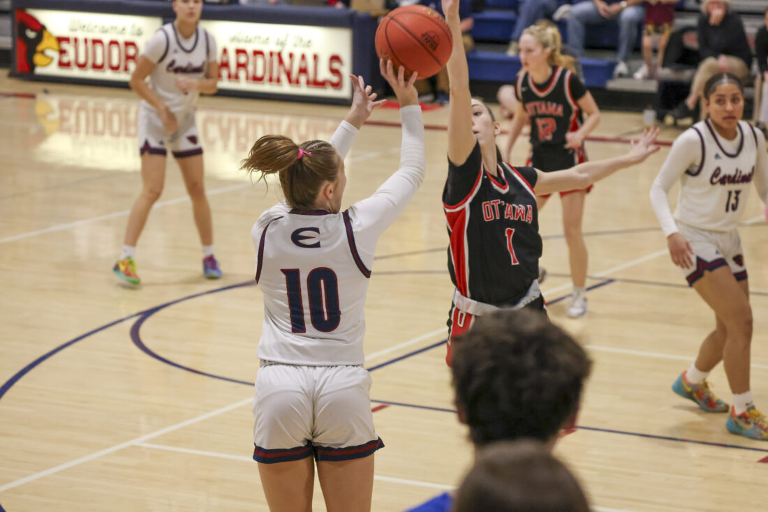 Eudora junior Brynn Deterding shoots a 3 over a leaping Ottawa defender during the Cardinals’ game on Friday, March 6, 2026, at Eudora High School in Eudora.