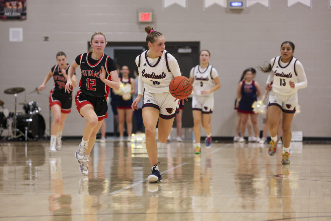 Eudora junior Brynn Deterding leads the fast break down the court after recording a steal in the Cardinals’ game against Ottawa on Friday, March 6, 2026, at Eudora High School in Eudora.