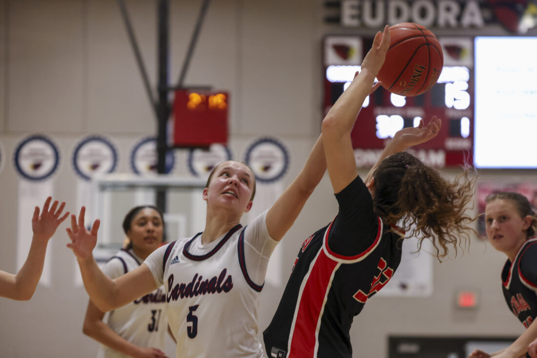 Eudora freshman Payton Lewis fights for a rebound during the Cardinals’ game against Ottawa on Friday, March 6, 2026, at Eudora High School in Eudora.