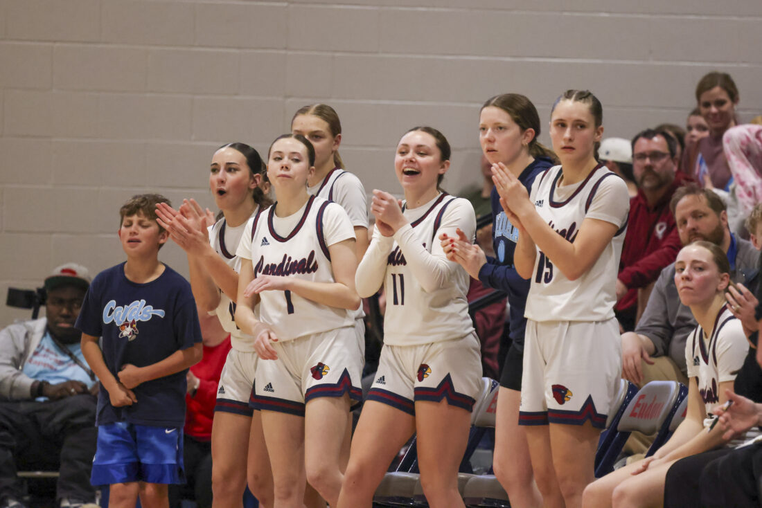 The Eudora bench celebrates a play during the Cardinals’ game against Ottawa on Friday, March 6, 2026, at Eudora High School in Eudora.