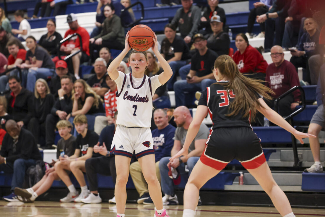 Eudora sophomore Karley Owens looks to shoot during the Cardinals’ game against Ottawa on Friday, March 6, 2026, at Eudora High School in Eudora.