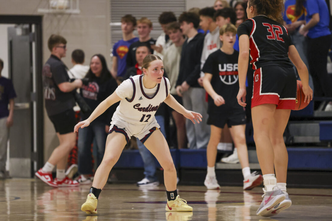 Eudora junior Brynn Deterding looks to skip a pass down court during the Cardinals’ game against Ottawa on Friday, March 6, 2026, at Eudora High School in Eudora.
