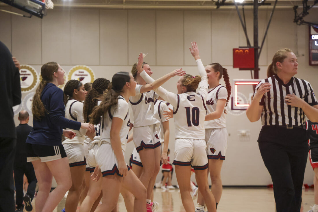 The Eudora girls basketball team celebrates its substate victory over Ottawa on Friday, March 6, 2026, at Eudora High School in Eudora.