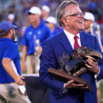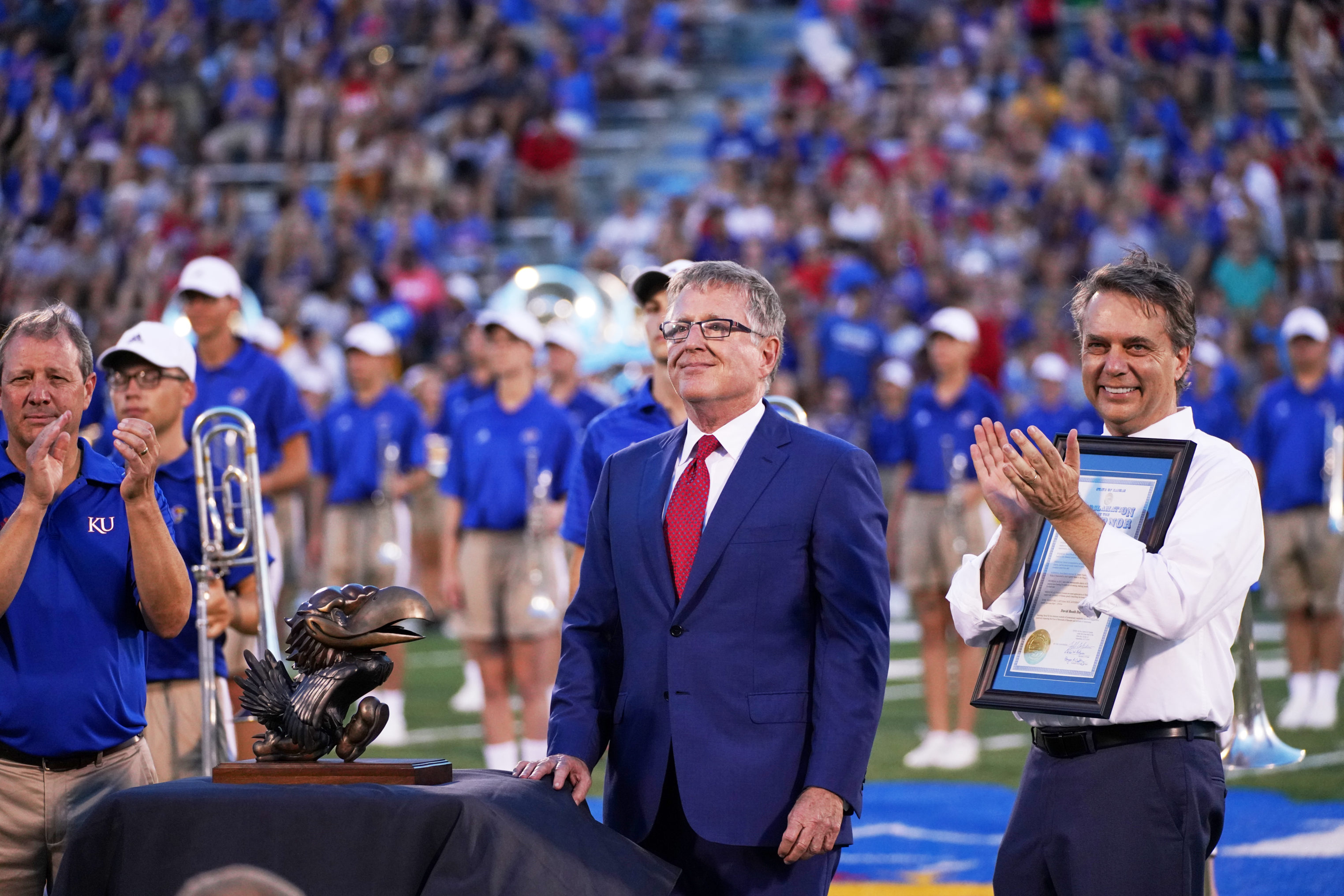 University of Kansas booster David Booth accepts a Jayhawk statue during a renaming ceremony for David Booth Kansas Memorial Stadium on Saturday, Sept. 1, 2018.