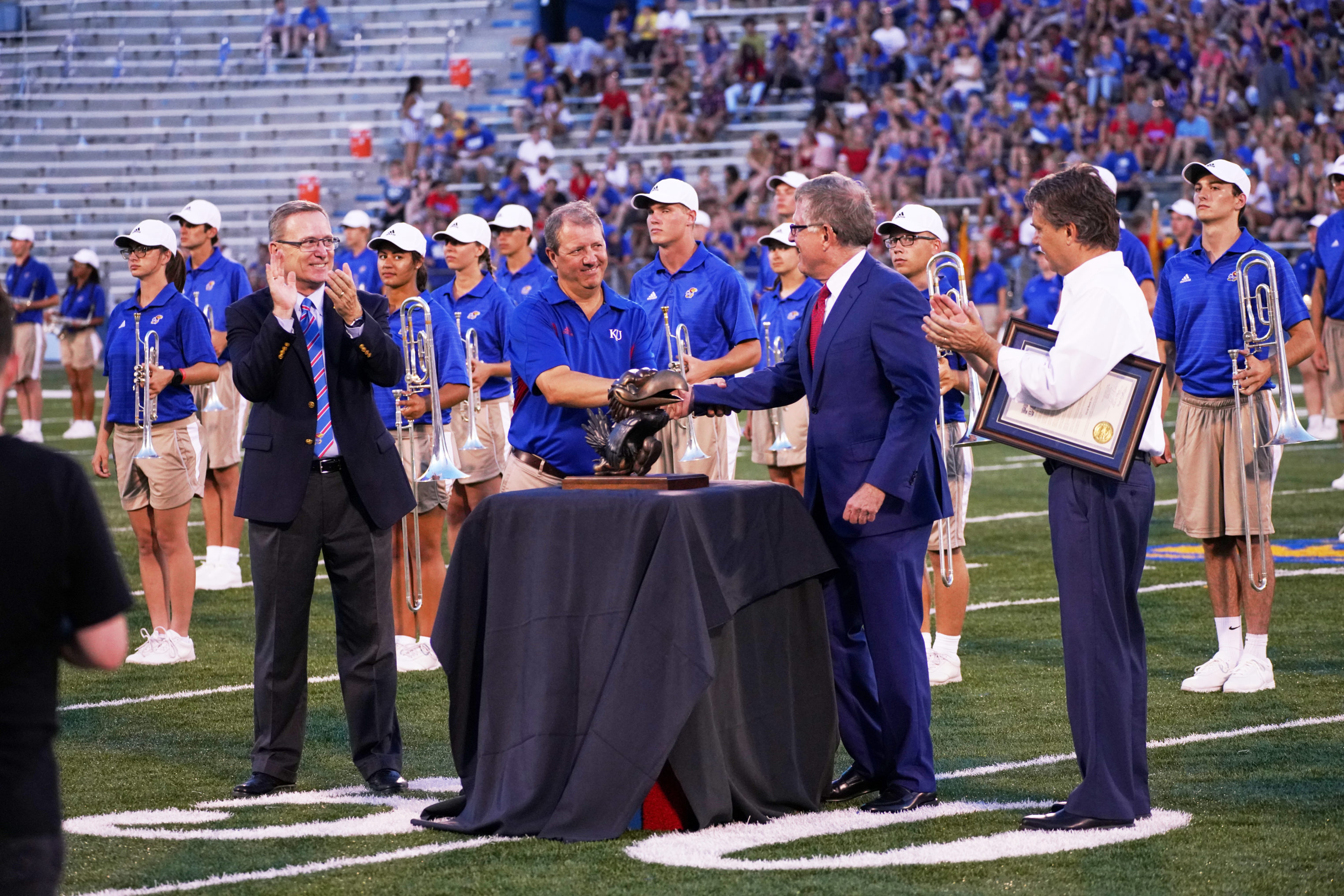 The university made it official with a ceremony at the 50-yard line, as new athletic director Jeff Long and Chancellor Douglas Girod presented Booth with a miniature Jayhawk statue shortly after the KU band spelled out his name in formation.