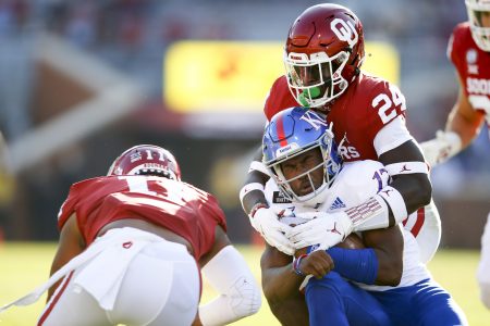 Oklahoma linebacker Brian Asamoah (24) tackles Kansas quarterback Jalon Daniels (17) during an NCAA college football game in Norman, Okla., Saturday, Nov. 7, 2020. (Ian Maule/Tulsa World via AP)