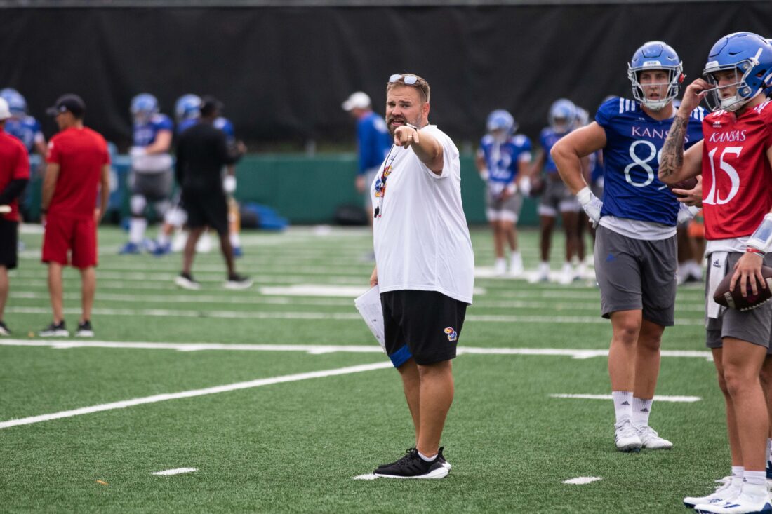 KU offensive coordinator Andy Kotelnicki calls out directions to the offense during practice on Aug. 4, 2022.