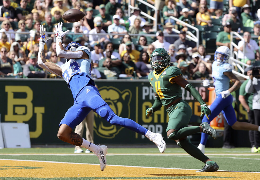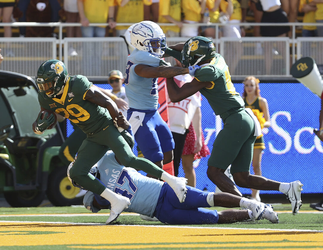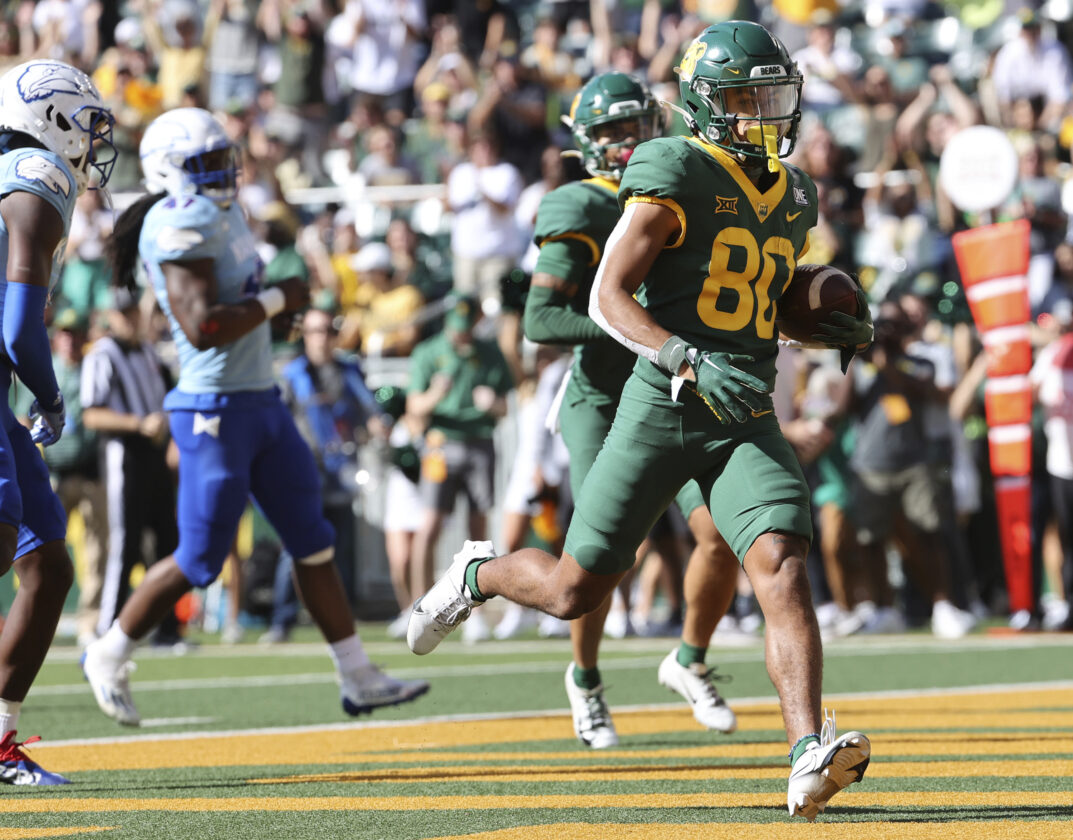 Baylor wide receiver Monaray Baldwin scores a touchdown against Kansas in the first half of an NCAA college football game, Saturday, Oct. 22, 2022, in Waco, Texas. (AP Photo/Jerry Larson)