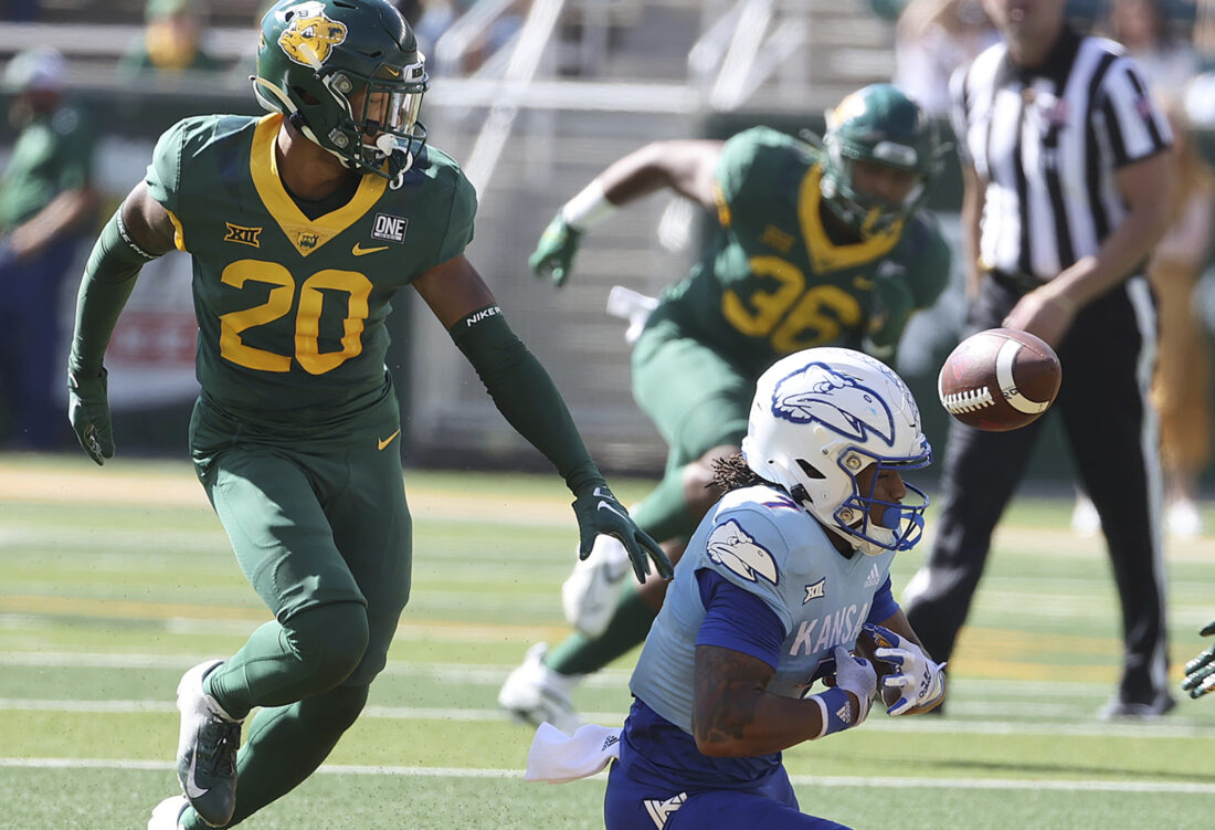 Kansas wide receiver Trevor Wilson attempts to catch the ball as Baylor safety Devin Lemear closes in during the first half of an NCAA college football game, Saturday, Oct. 22, 2022, in Waco, Texas. (AP Photo/Jerry Larson)