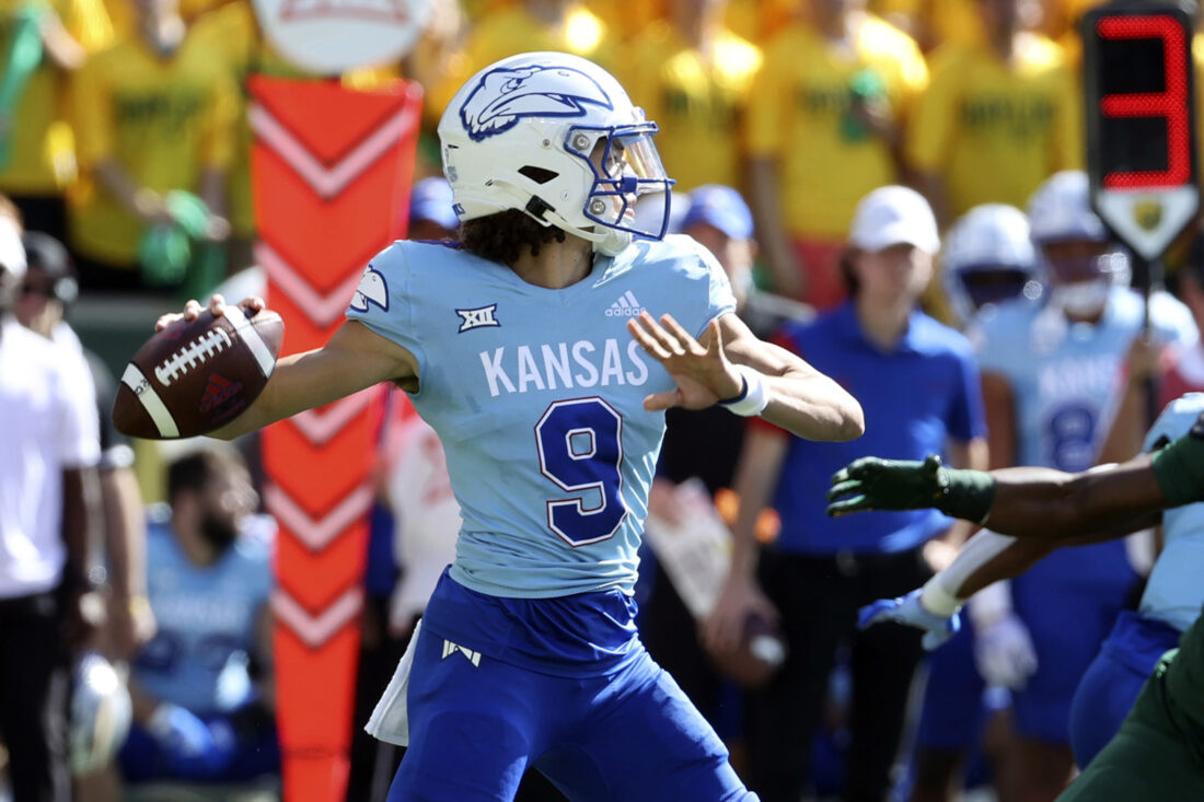 Kansas quarterback Jason Bean looks to pass against Baylor in the first half of an NCAA college football game, Saturday, Oct. 22, 2022, in Waco, Texas. (AP Photo/Jerry Larson)