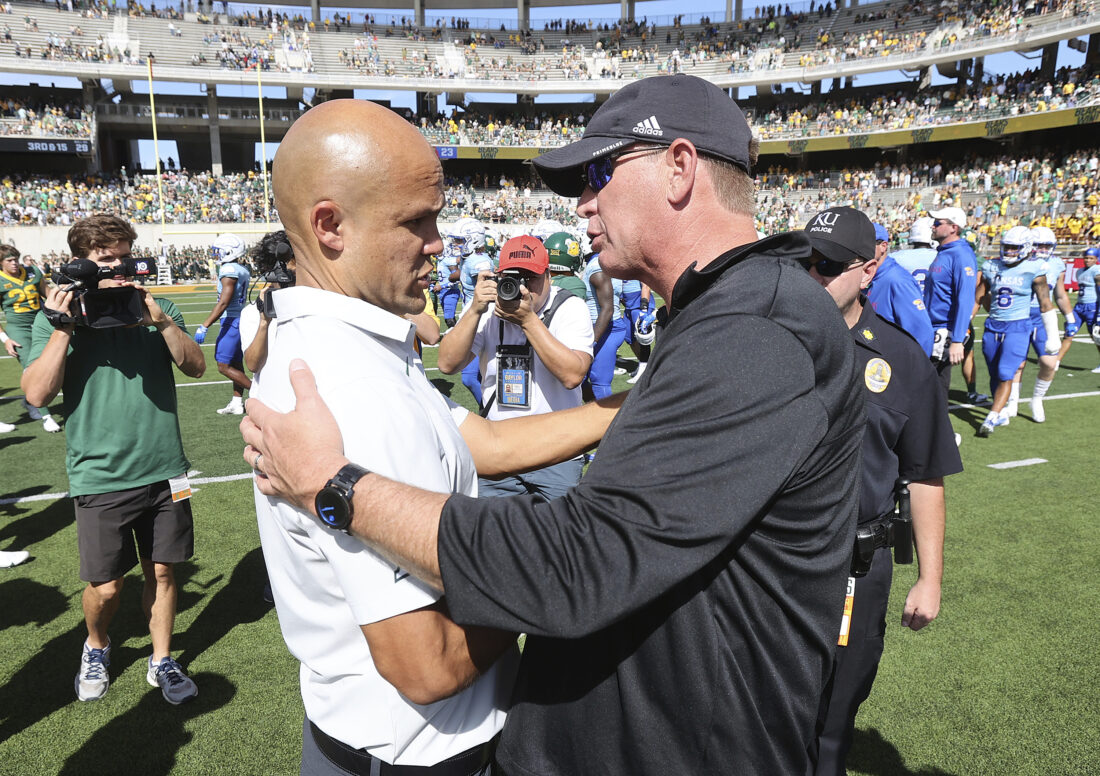 Baylor head coach Dave Aranda, left, and Kansas head coach Lance Leipold, right, shake hands after an NCAA college football game, Saturday, Oct. 22, 2022, in Waco, Texas. (AP Photo/Jerry Larson)