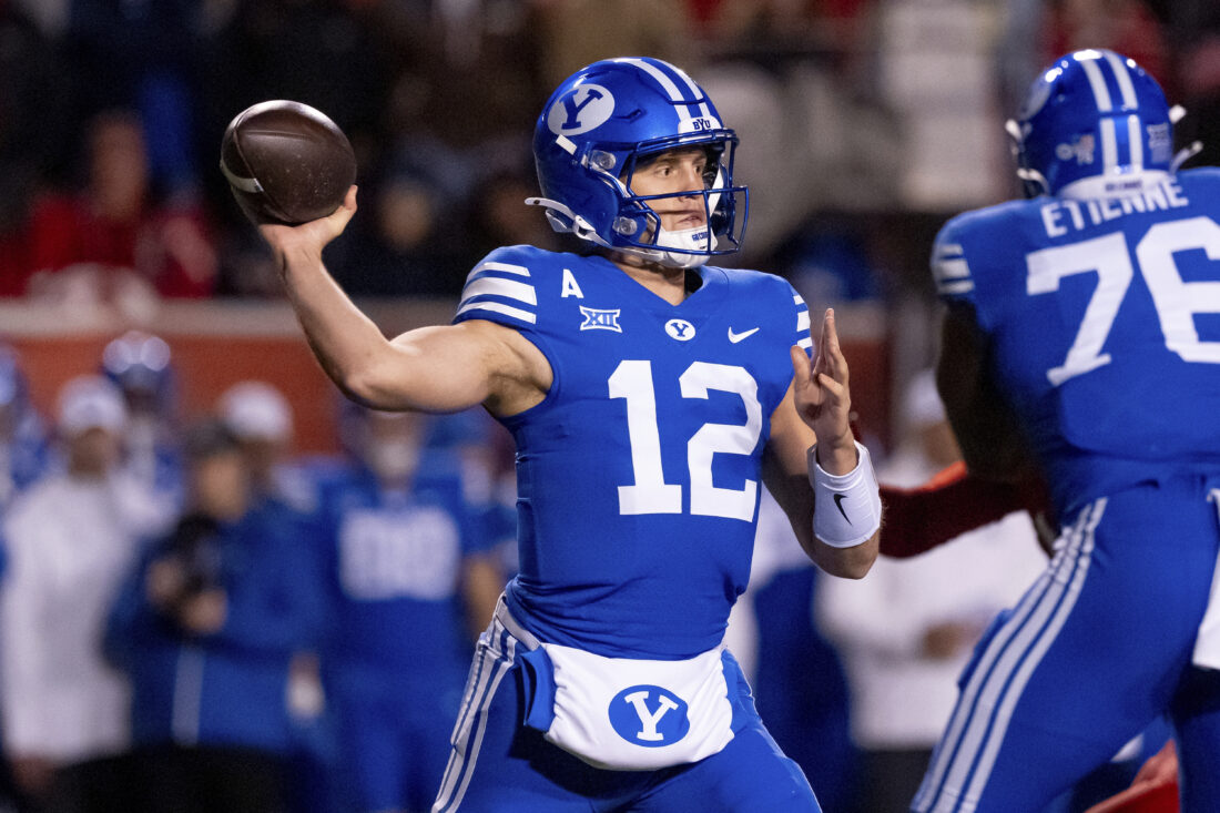 BYU quarterback Jake Retzlaff passes in the first half of an NCAA college football game against Utah, Saturday, Nov. 9, 2024, in Salt Lake City.