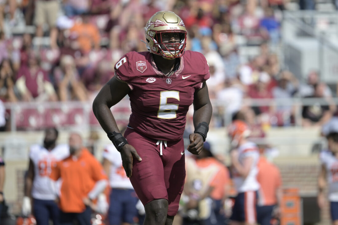 Florida State defensive lineman Dennis Briggs Jr. (6) sets up for a play during the second half of an NCAA college football game against Syracuse, Saturday, Oct. 14, 2023, in Tallahassee, Fla.