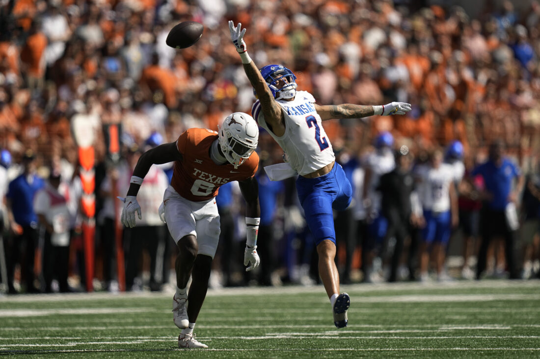 Kansas wide receiver Lawrence Arnold (2) fails to make a catch as Texas defensive back Terrance Brooks (8) defends against the play during the first half of an NCAA college football game in Austin, Texas, Saturday, Sept. 30, 2023.