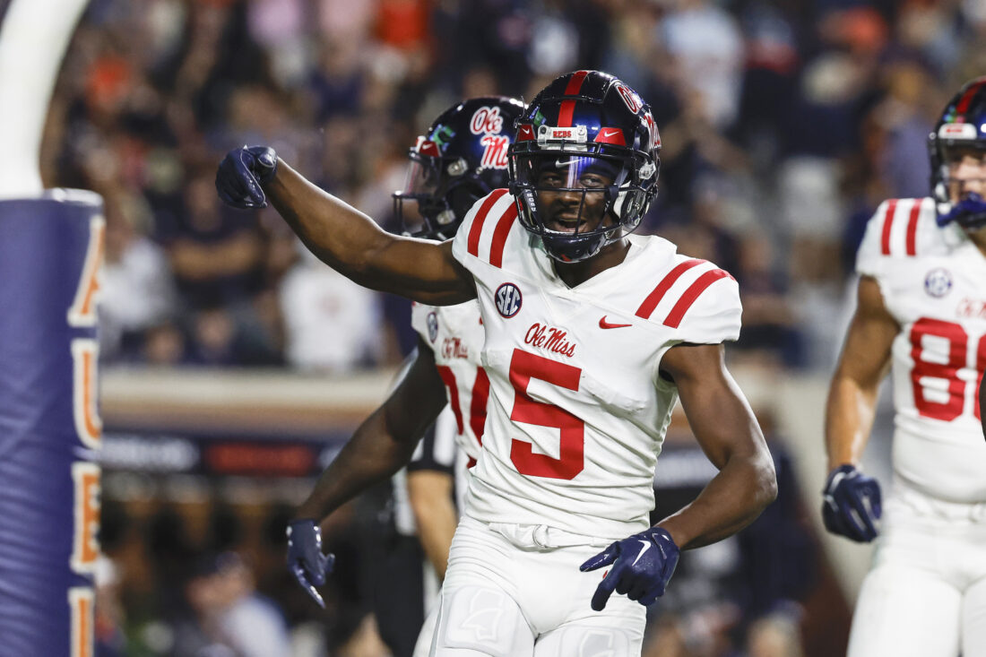 Mississippi wide receiver Zakhari Franklin (5) celebrates after scoring a touchdown against Auburn during the first half of an NCAA college football game, Saturday, Oct. 21, 2023, in Auburn, Ala.
