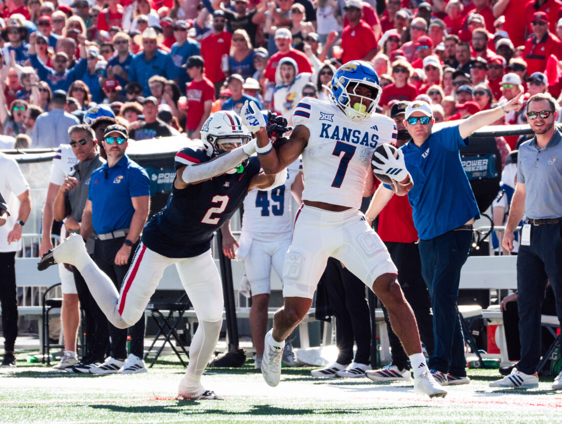 Kansas wide receiver Emmanuel Henderson Jr. celebrates a first down in the fourth quarter against Arizona on Saturday, Nov. 8, 2025, in Tucson, Ariz.