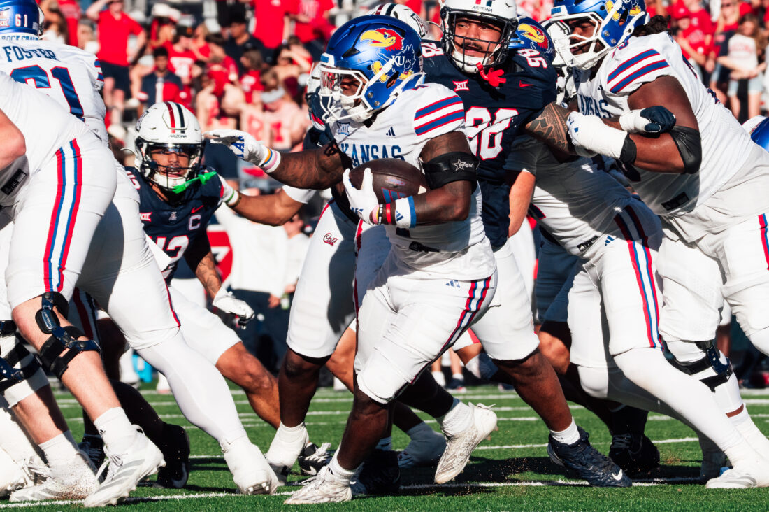Kansas running back Leshon Williams makes a move to avoid Wildcat defenders against Arizona on Saturday, Nov. 8, 2025, in Tucson, Ariz.
