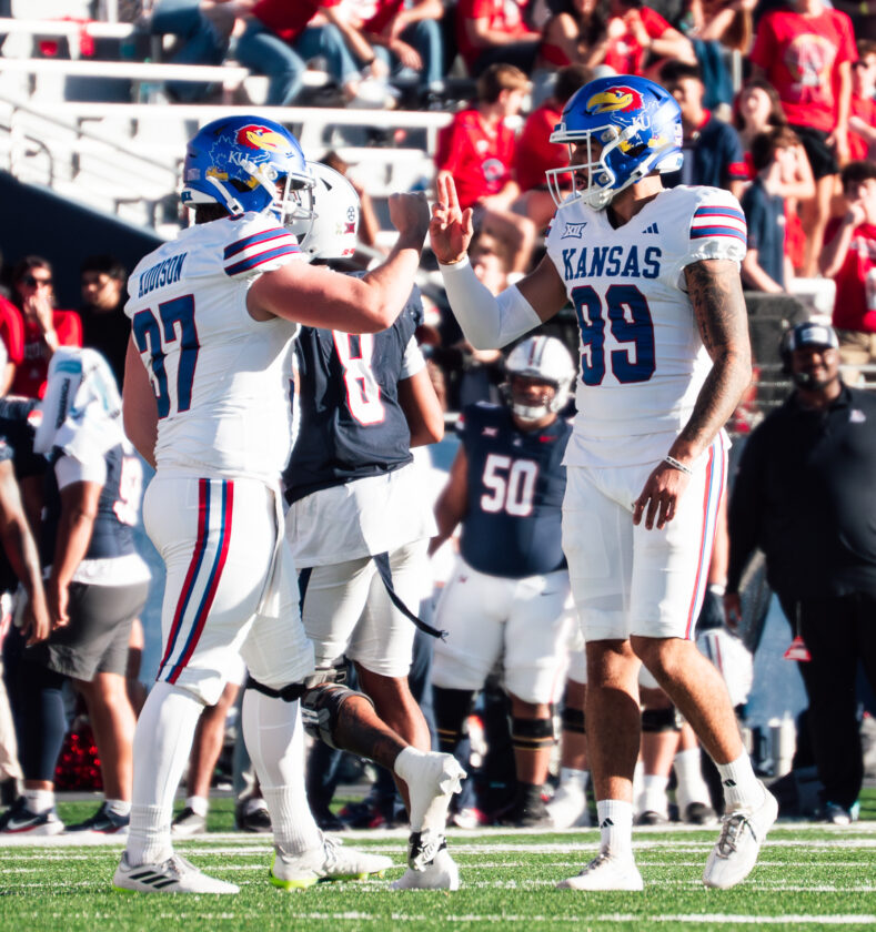 Kansas punter Grayden Addison and kicker Laith Marjan celebrate after Marjan kicked a field goal against Arizona on Saturday, Nov. 8, 2025, in Tucson, Ariz.