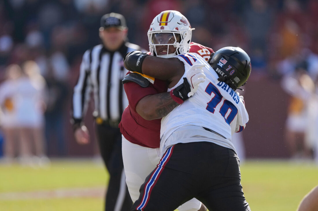 Iowa State defensive lineman Domonique Orange (95) shoves off Kansas offensive lineman Kobe Baynes (70) during the first half of an NCAA college football game, Saturday, Nov. 22, 2025, in Ames, Iowa.