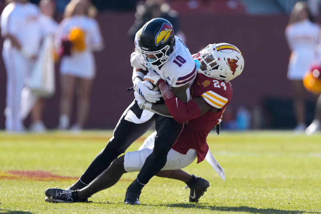 Iowa State defensive back Quentin Taylor (24) tackles Kansas wide receiver Levi Wentz (10) during the first half of an NCAA college football game, Saturday, Nov. 22, 2025, in Ames, Iowa.