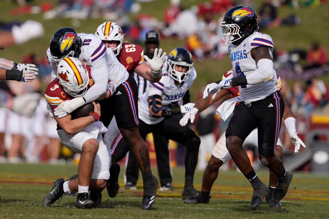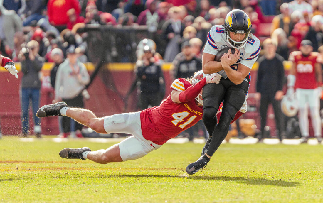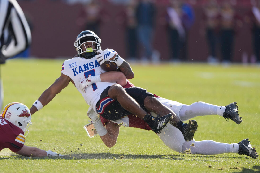 Kansas quarterback Cole Ballard gets dragged down by Iowa State linebacker Rylan Barnes during the game against Iowa State on Saturday, Nov. 22, 2025, in Ames, Iowa.
