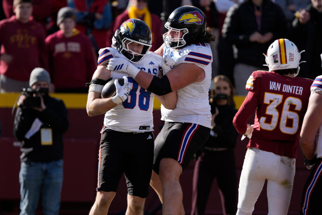 Kansas tight end Boden Groen (88) celebrates his touchdown with offensive lineman Nolan Gorczyca (59) during the second half of an NCAA college football game against Iowa State, Saturday, Nov. 22, 2025, in Ames, Iowa. Iowa State won 38-14.