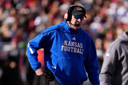 Kansas head coach Lance Leipold walks back to the sideline after an injury timeout during the second half of an NCAA college football game against Iowa State, Saturday, Nov. 22, 2025, in Ames, Iowa. Iowa State won 38-14.