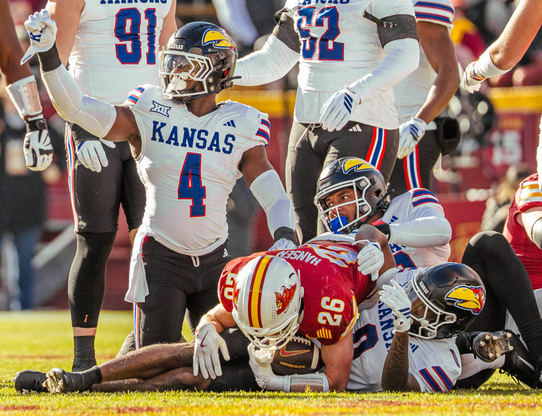 Kansas linebacker Bangally Kamara and defensive tackle Tommy Dunn Jr. secure a tackle in the backfield during the game against Iowa State on Saturday, Nov. 22, 2025, in Ames, Iowa.